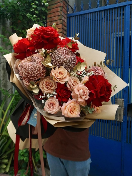 BÓ HOA TONE ĐỎ NÂU, CÚC MẪU ĐƠN NÂU, HỒNG NÂU CAPU MIX HỒNG HEART NHẬP