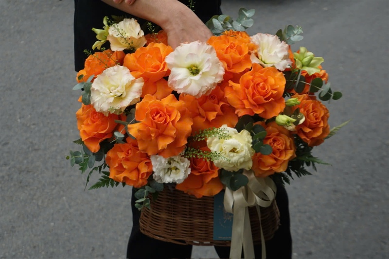 GIỎ HOA TONE CAM, HỒNG CAM QUỐC VƯƠNG DL MIX CÁT TƯỜNG CAM