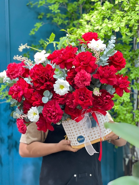 Giỏ hoa tone đỏ, cẩm chướng đỏ hồng đỏ lận cánh , 1 ít cát tường