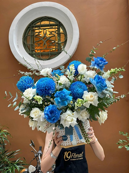 GIỎ HOA TONE TRẮNG - XANH BLUE, CÚC MĐ