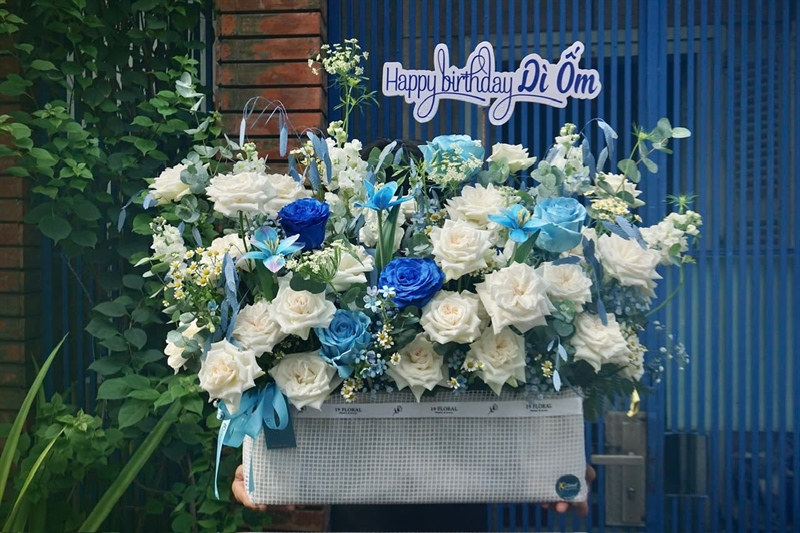 Hộp chữ nhật bọc giấy, tone trắng xanh blue, tulip xanh nhuộm