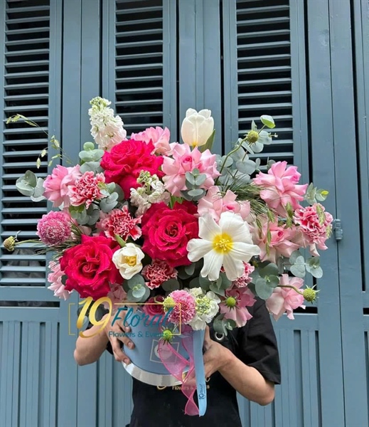 HỘP HOA TONE HỒNG, 3 FULL MONTY MIX HOA LÁ PHỤ