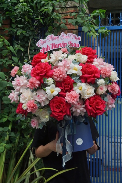 Hộp hoa tone hồng chủ đạo, full monty mix tulip và hoa lá phụ