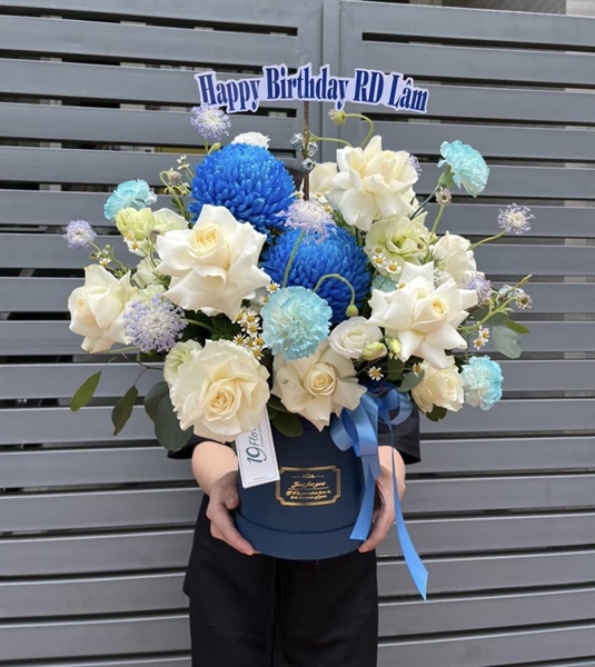 HỘP HOA TÔNG TRẮNG - XANH DƯƠNG, CÚC MẪU ĐƠN XANH MIX HOA LÁ PHỤ