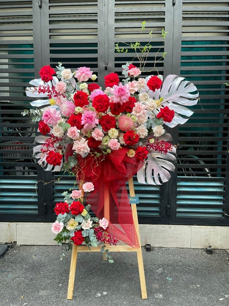 Kệ hoa chúc mừng tone đỏ hồng, lá trầu bà xịt bạc