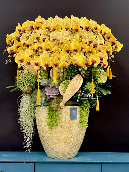 Chậu lan 20 cành hồ điệp vàng trang trí nhiều sen đá và cây xanh , chậu khảm trai cao cấp