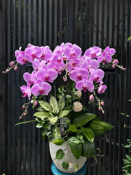 Chậu lan 5 hồ điệp hồng trang trí cây xanh