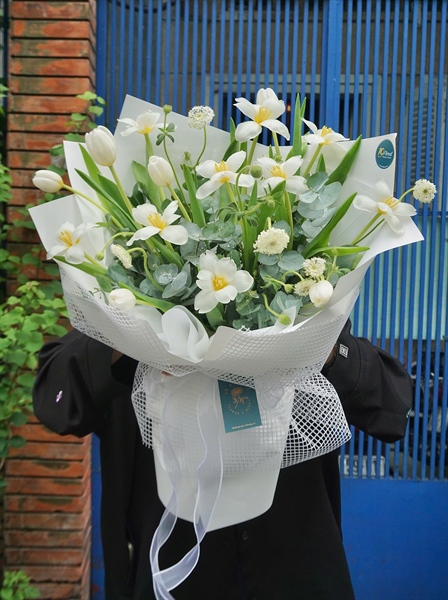 15 TULIP TRẮNG MIX VOAN VÀ LÁ PHỤ