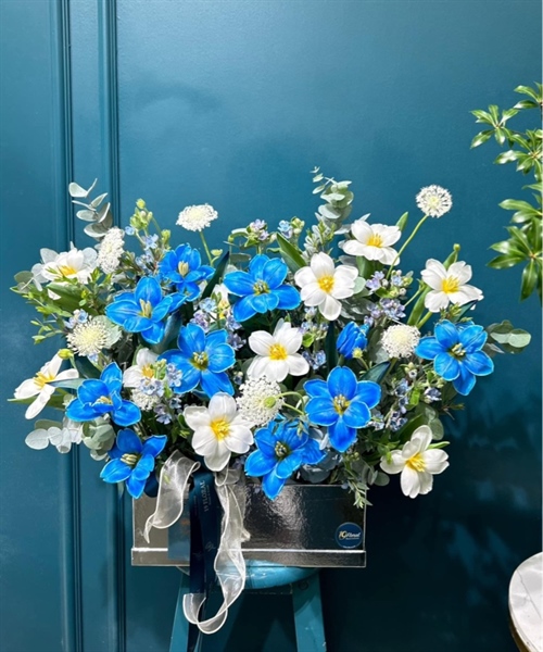 20 tulip xanh blue mix trắng cùng hoa lá phụ