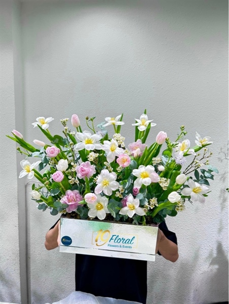30 tulip trắng mix hồng nhạt và hoa lá phụ