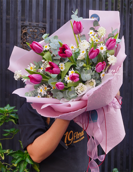 Bó hoa Tulip Delta Graffiti mix cúc trắng nhật