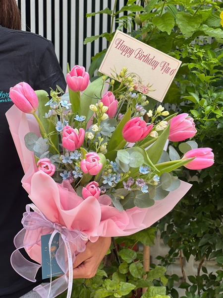 Chậu 10 cành tulip hồng mix hoa lá phụ