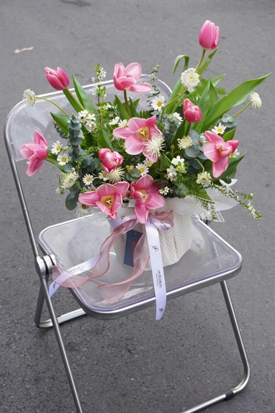 HỘP 10 HOA TULIP HỒNG, MIX HOA LÁ PHỤ
